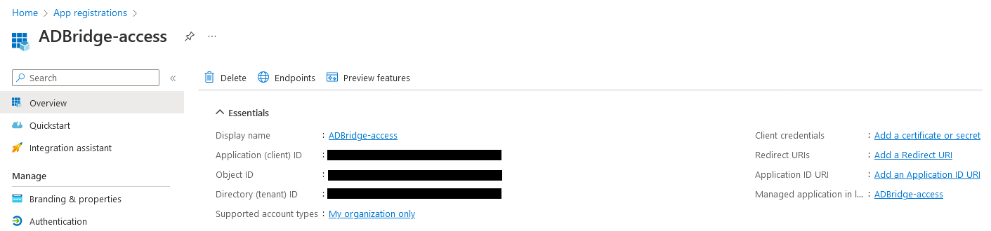 - Create an app registration and gather the Client ID and Directory (tenant) ID from it.