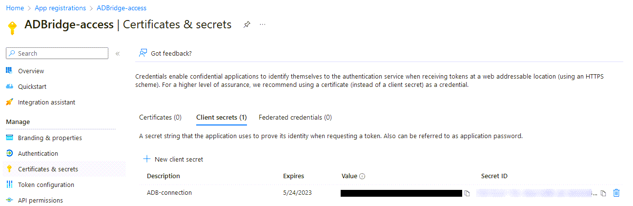 - Go to Certificates & secrets > Client secrets.