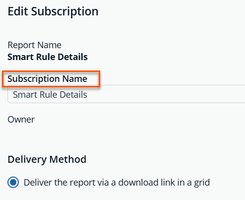 You can update the Subscription Name field for each report subscription and view that name wherever subscriptions are listed. This makes it easier to distinguish between multiple subscriptions for the same report based on their purpose or audience.