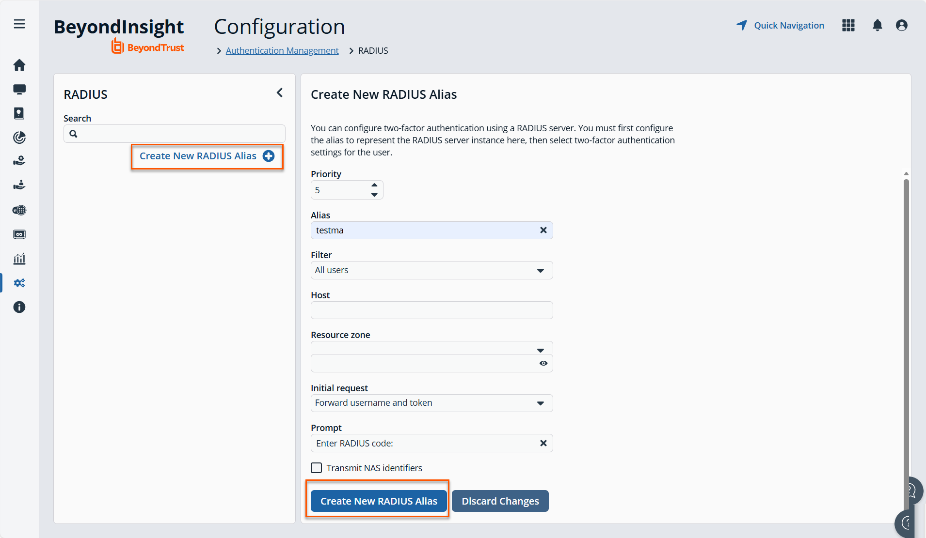 In BeyondInsight, you must first configure the alias to represent the RADIUS server instance, and then select two-factor authentication settings for the user.
