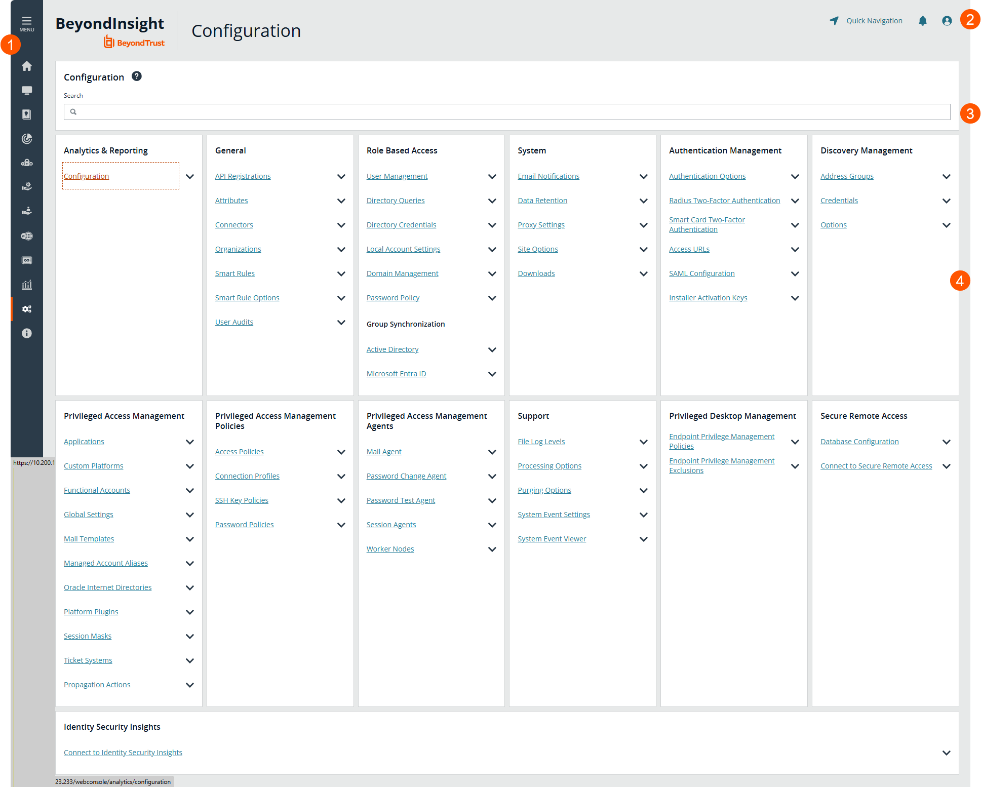 This URL is provided in the BeyondTrust welcome email. - From the left menu, click Configuration.