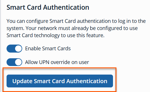 Click the toggle to enable the Allow UPN Override On User option. This enables a BeyondInsight user with a smart card that has a different Subject Alternative Name to log into BeyondInsight and maps the smart card to the user.