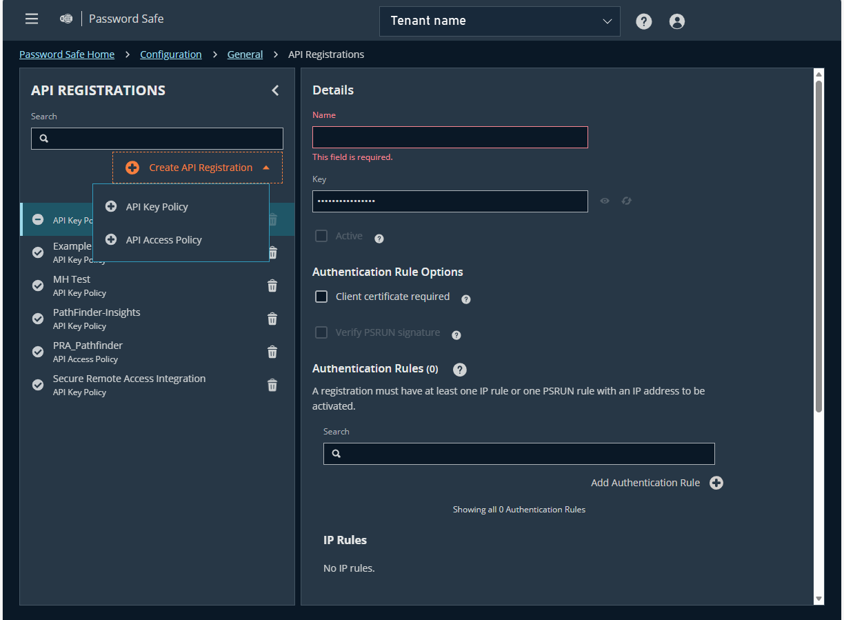 - At least one IP rule or PSRUN rule is required, providing a valid source IP address (IPv4 or IPv6), an IP range, or CIDR from which requests can be sent for this API key (one IP address, IP range, or CIDR per line).