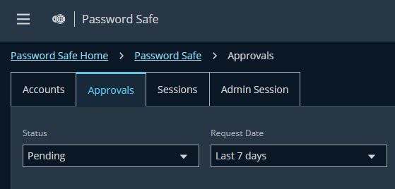The Approvals tab displays for administrators and users who have been assigned the Approver role for any managed systems in Password Safe.