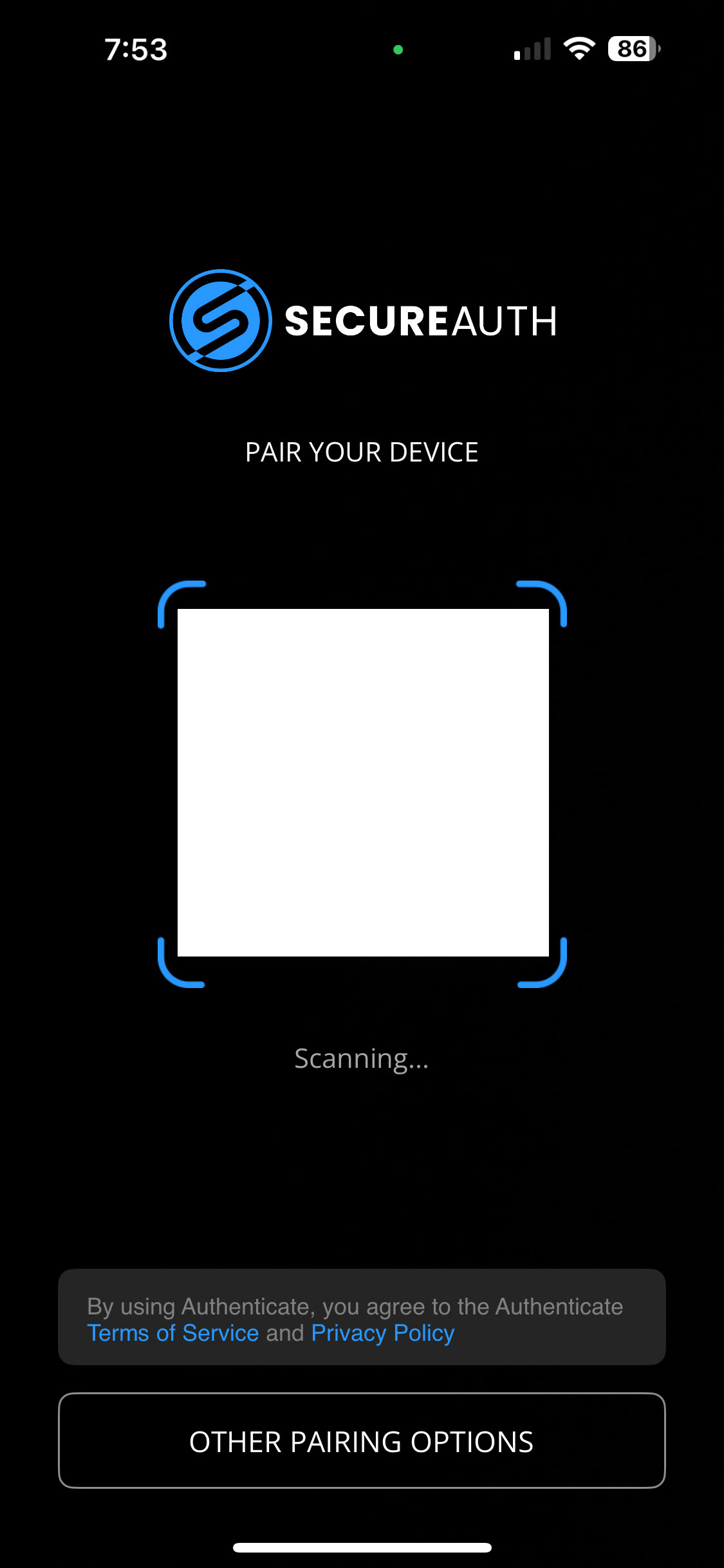 Install the SecureAuth app on a mobile device and click the bar code to scan.