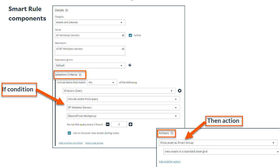 When you use a Smart Rule to register assets as Smart Groups, you can run Discovery Scans, and monitor and view assets. Smart rules can: