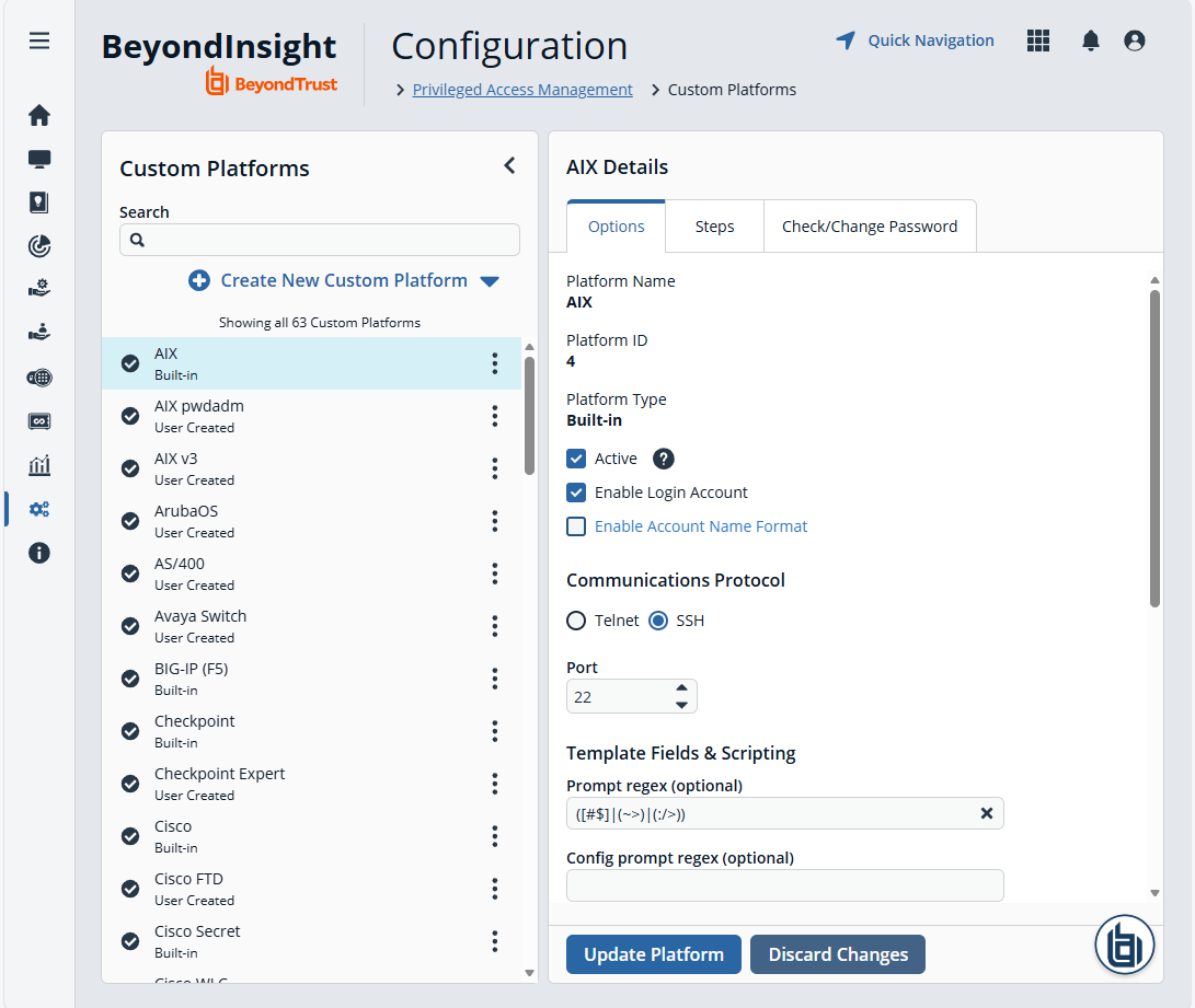 You can modify the details of built-in custom platforms to meet the needs of your environment. You can create new custom platforms for advanced configurations that are not supported by the built-in platforms, or for a platform that is currently not supported by Password Safe. You can also create new custom platforms by cloning a built-in or user-created custom platform.