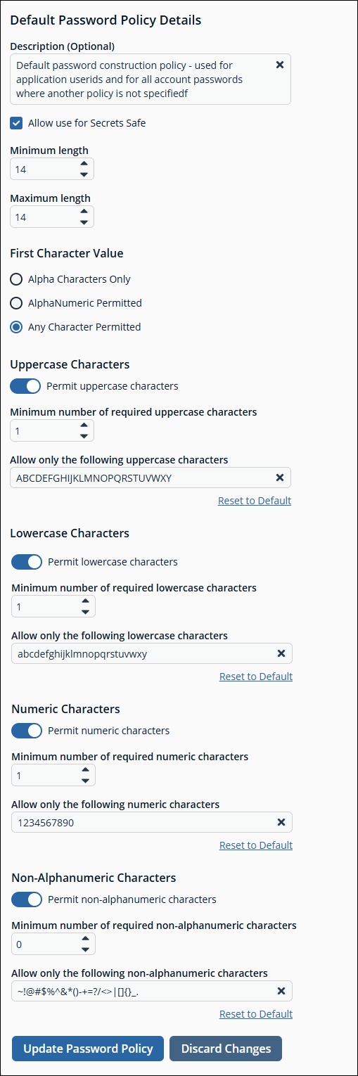 Password Safe ships with a default password policy used to generate new passwords for auto managed accounts.