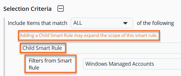 - When you make changes to the Smart Rules Filters page and modify the criteria for a child Smart Rule, the following inline warning displays: Adding a Child Smart Rule may expand the scope of this smart rule.