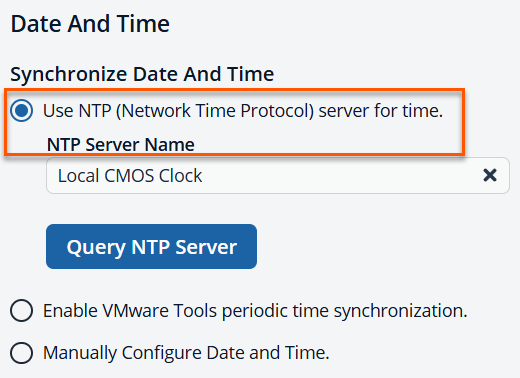 From the Date And Time section, use the appropriate methods to synchronize the date and time. The default method is using the Network Time Protocol (NTP).