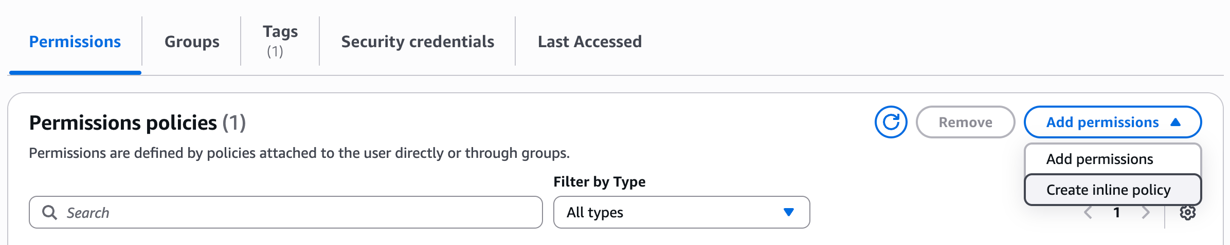 "sts:ExternalId"and save the value; you will need it later in this guide. - Add an inline policy to the user you’ve just created