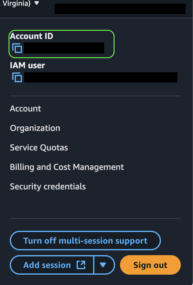 Click the top-right corner of your screen and copy it the value under Account ID. Save it for later on in the configuration.