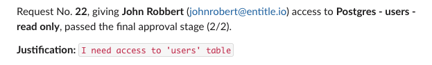 In the chat box, type /entitle and select access_request from the options. The following dialog is prompted: