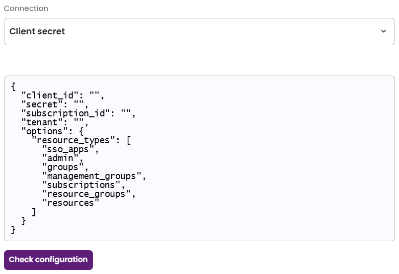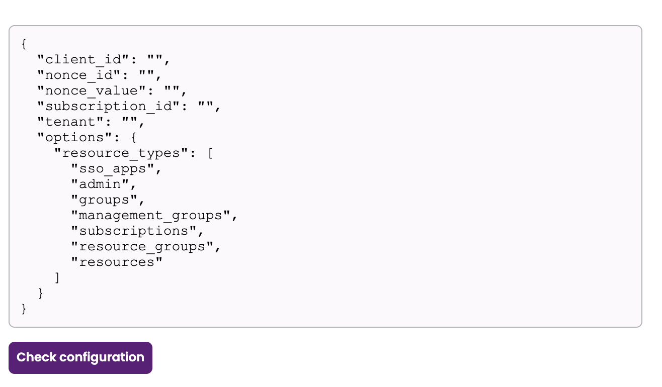 { "client_id": "<YOUR_CLIENT_ID>", "secret": "<YOUR_CLIENT_SECRET>", "subscription_id": "<YOUR_SUBSCRIPTION_ID>", "tenant": "<YOUR_TENANT_ID>", "options": { "resource_types": [ "sso_apps", "admin", "groups", "management_groups", "subscriptions", "resource_groups", "resources" ] } }