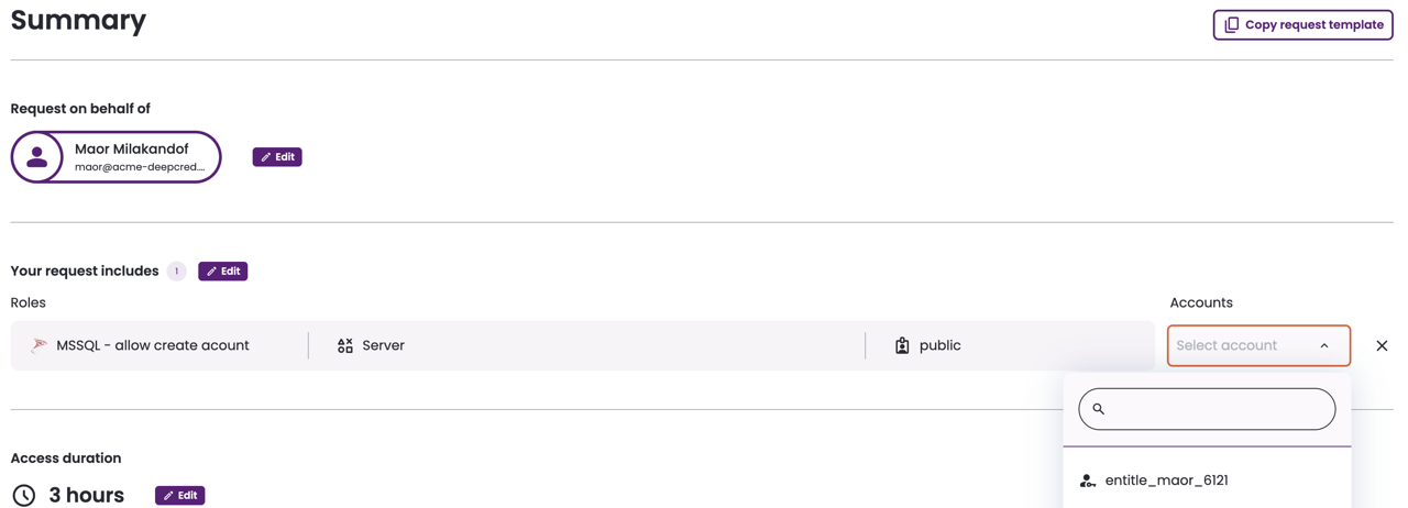 - Select an account to associate with your request. You are not requesting access to the actual user account; instead, Entitle creates an ephemeral account with the same permissions. This temporary account is prefixed with entitle so that any actions you perform are easy to identify, ensuring security and auditability by isolating your activity from the original account.