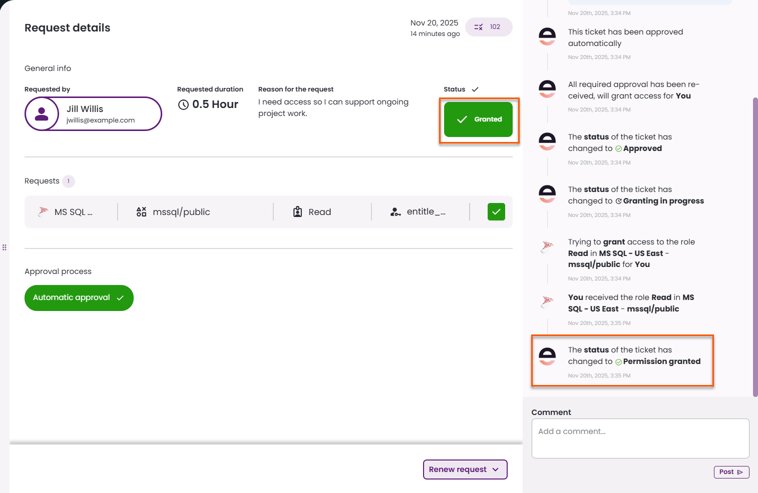 If MS SQL Server accounts are not mapped, an error occurs when attempting to request access.