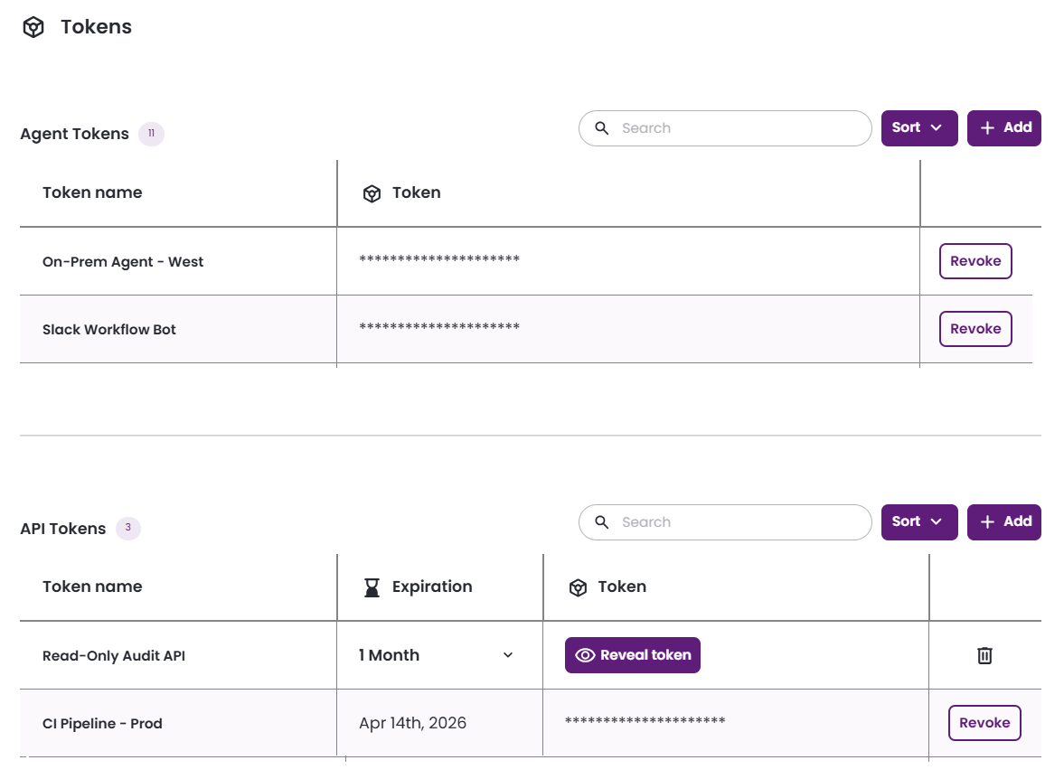 - In the Tokens section, click Add to create a new Agent token or API token.
