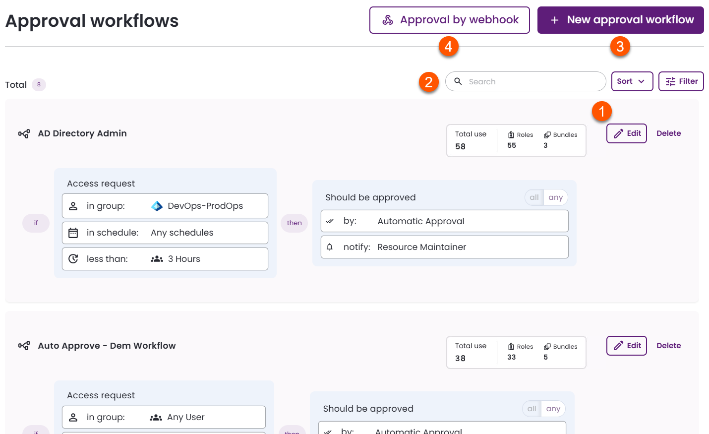 Edit approval workflow: You can modify the workflow name, access request conditions, and approval steps. you can also add or remove rules and steps, and change rule order using the arrows at the left. After making changes, click Save approval workflow.