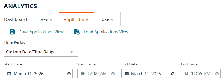 - Updated Custom Date & Time Range in Saved Applications View & Load Applications View within Analytics, Applications page