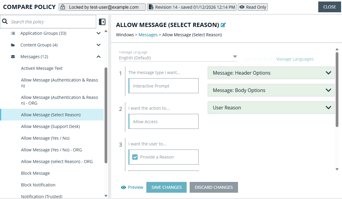| Policy Editor | In read-only mode, the Message Name and Description fields appeared editable, even though those changes could not be saved. Experienced in Windows and macOS messages. | Updated these fields so Message Name and Message Description are not editable when accessing a policy in Read Only mode. |