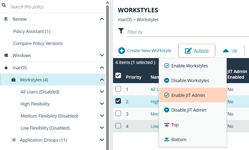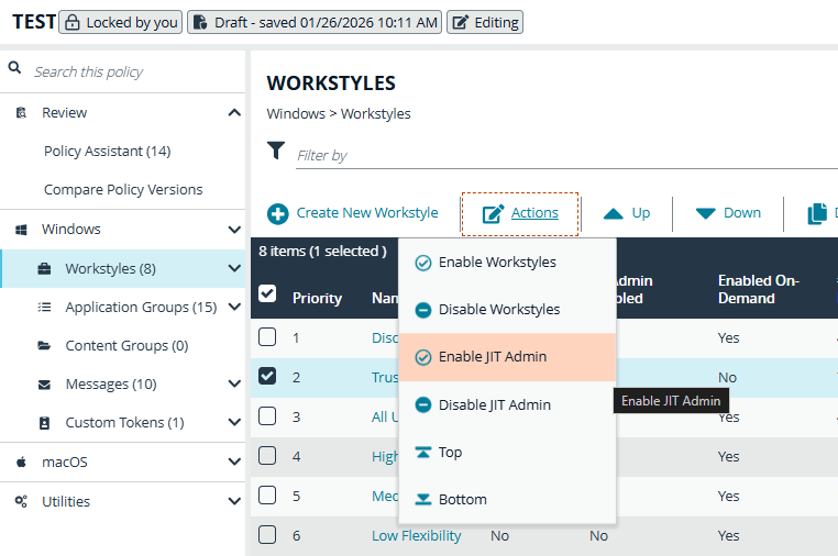 - Select a Workstyle, and then select Actions > Enable JIT Admin from the menu.