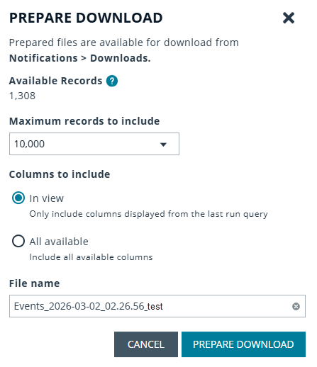 to export all analytics data results in the currently filtered result set. The CSV download can include up to 5 million records when downloading from the Events page. -
