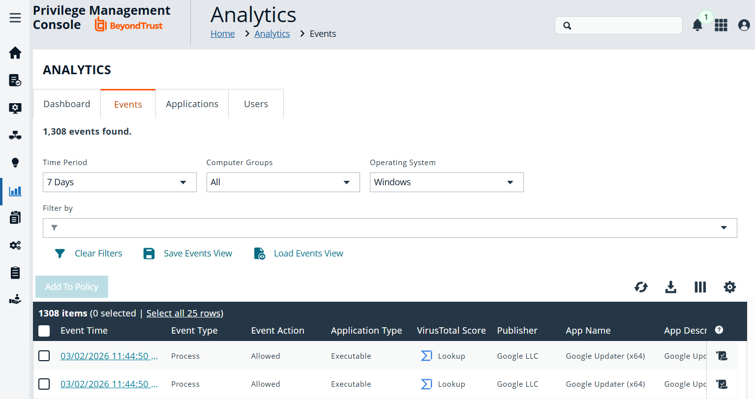 Use the Events page to easily find all elevated applications, applications that are newly-matched to an application rule, or applications that are elevated by on-demand application rules.