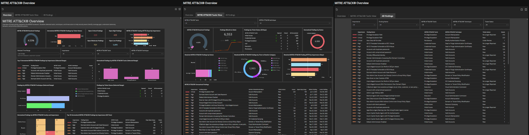 - Overview: High-level distribution of tactics, techniques, and threat actors, with filters for date ranges, severity, and tactic/technique selection.