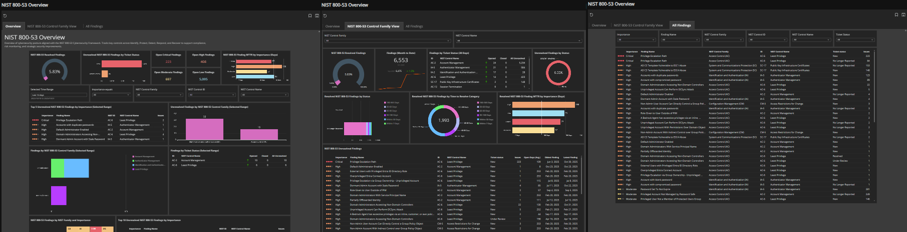 - Overview: High-level view of control coverage and posture trends, with filters for date ranges, control categories, and importance levels.