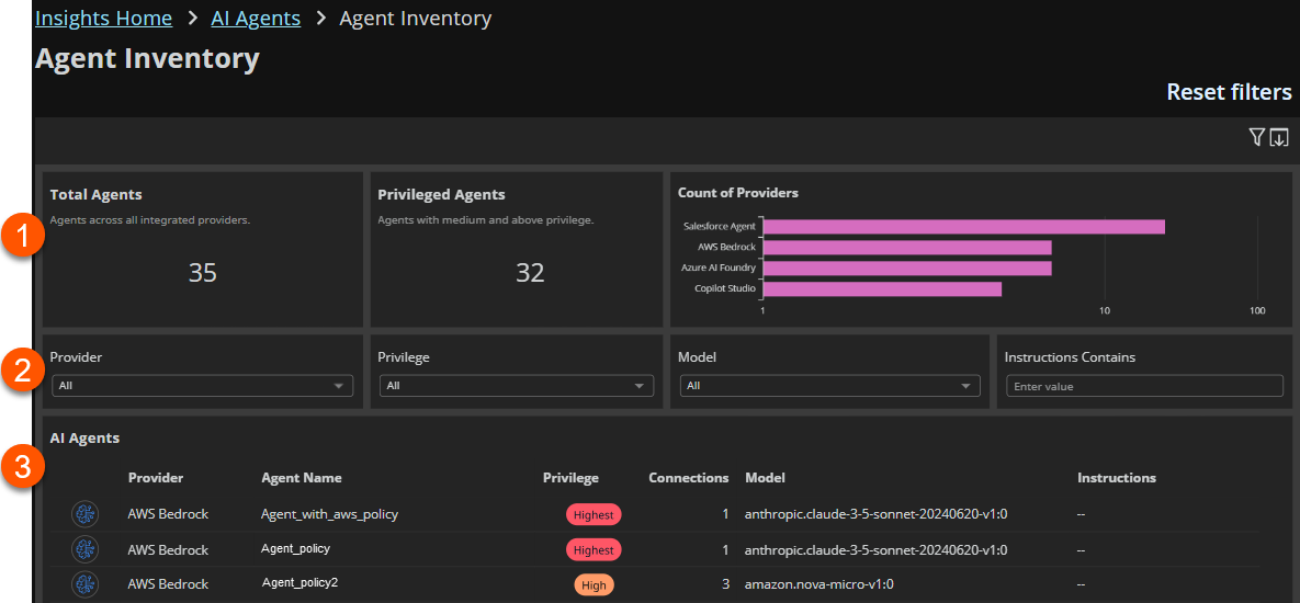- Summary metrics show total agents, privileged agents, and provider distribution for quick situational awareness. It's a quick snapshot that helps you understand the scale and spread of AI activity in your environment.