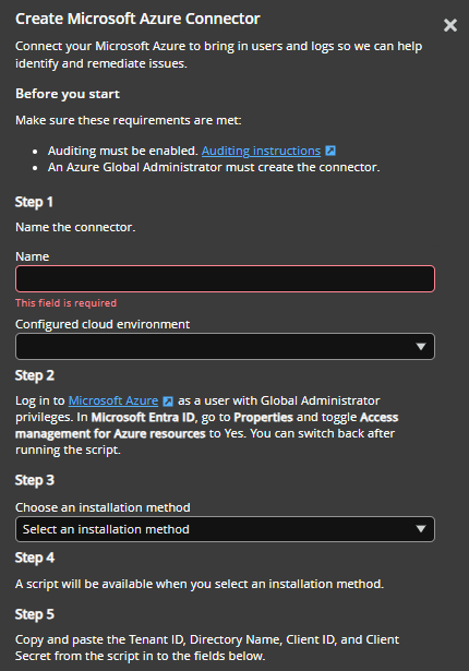 The Azure connector provides a script to retrieve the tenant ID, directory name, client ID, and client secret. For tenants with more than 100,000 users, set up the connector with Azure Event Hub.