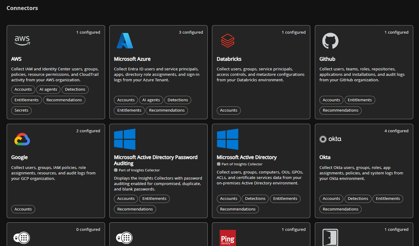 - Tiles on the Connectors page display labels showing what each connector adds to Insights: Accounts, AI Agents, Detections, Entitlements, Recommendations, Secrets.