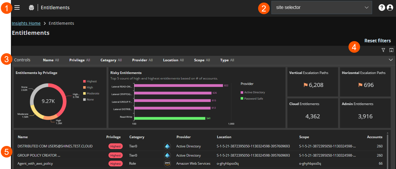 The Entitlements page allows you to review the key entitlements associated with your organization, and evaluate whether to remove or replace them with lower privileges. It allows you to view which accounts have access to your organization's key entitlements.