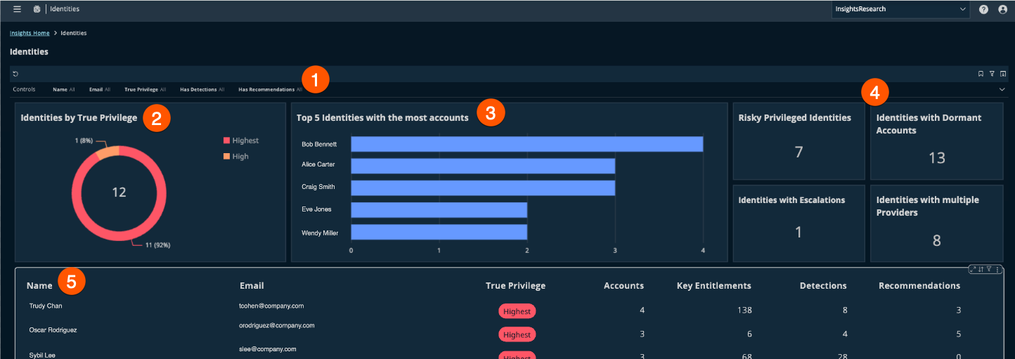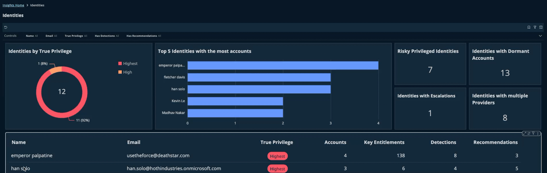 - Identities by True Privilege : Shows the total count of identities that have high and highest True Privilege, with the percentage amount of both.