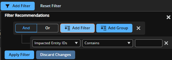 - recommendation: Enter a Recommendation Name and, optionally, select a filter. Filters include is equal to, is not equal to, Contains, Starts with, Ends with, and Does not contain.