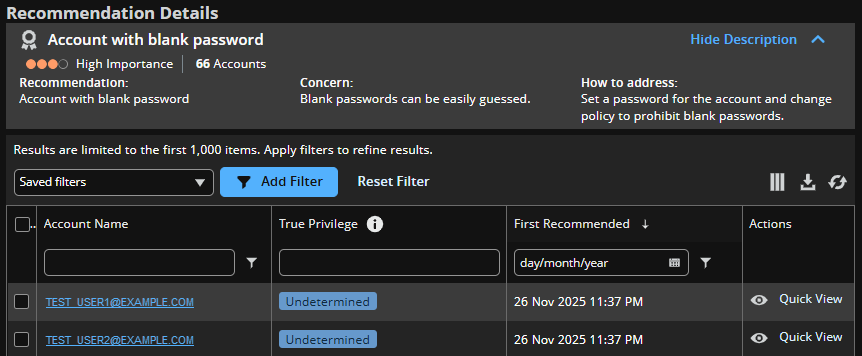 View your Recommendation details to see a list of all accounts or entities that would benefit from the recommended action, such as enabling multi-factor authentication, identifying linked account privileges, or verifying dormant accounts.