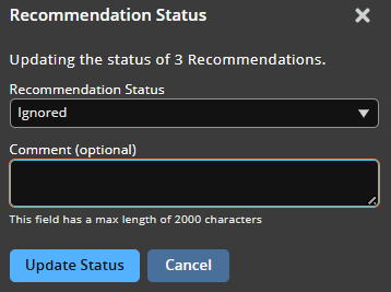 Authorized users can change the status of a recommendation, and they can include an optional comment to describe the nature of the update or change. The status change and comment history are viewable on the Recommendation Details page.