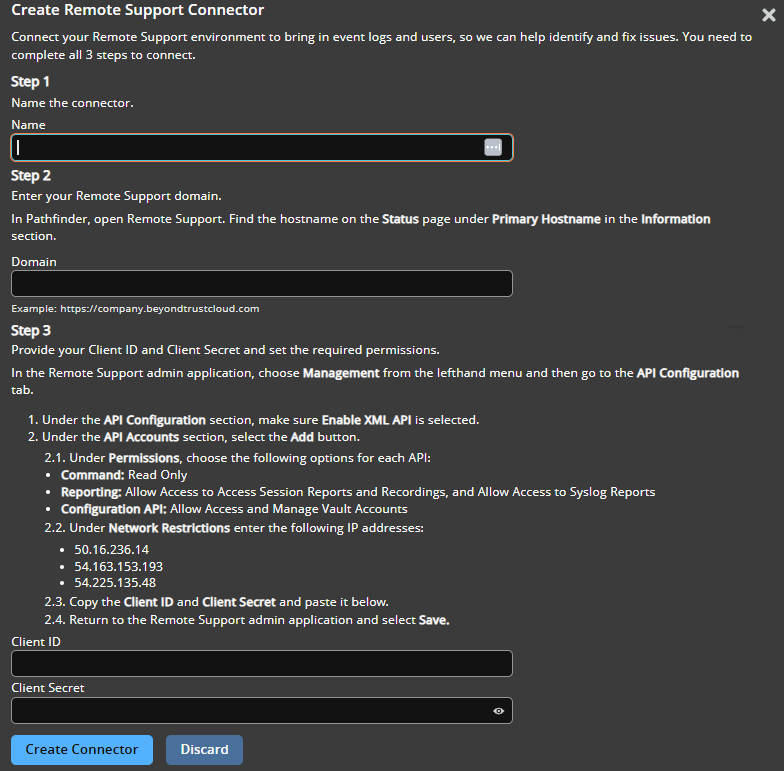 - Remote Support Domain: Your Remote Support domain, e.g., subdomain.beyondtrustcloud.com.