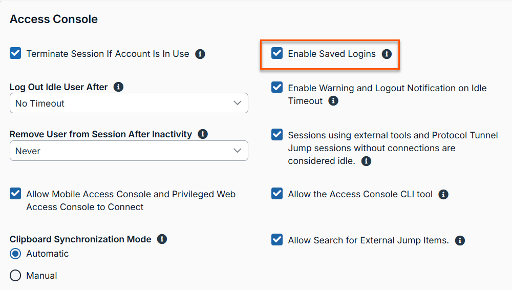 Check Enable Saved Logins to have the console save your username and password. This option can be enabled or disabled from /login > Management > Security.