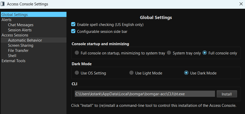 The Command Line Interface (CLI) tool allows you to initiate and manage remote sessions directly from the command line. This is available if an admin has checked Allow the Access Console CLI tool under Access Console at /login > Management > Security.