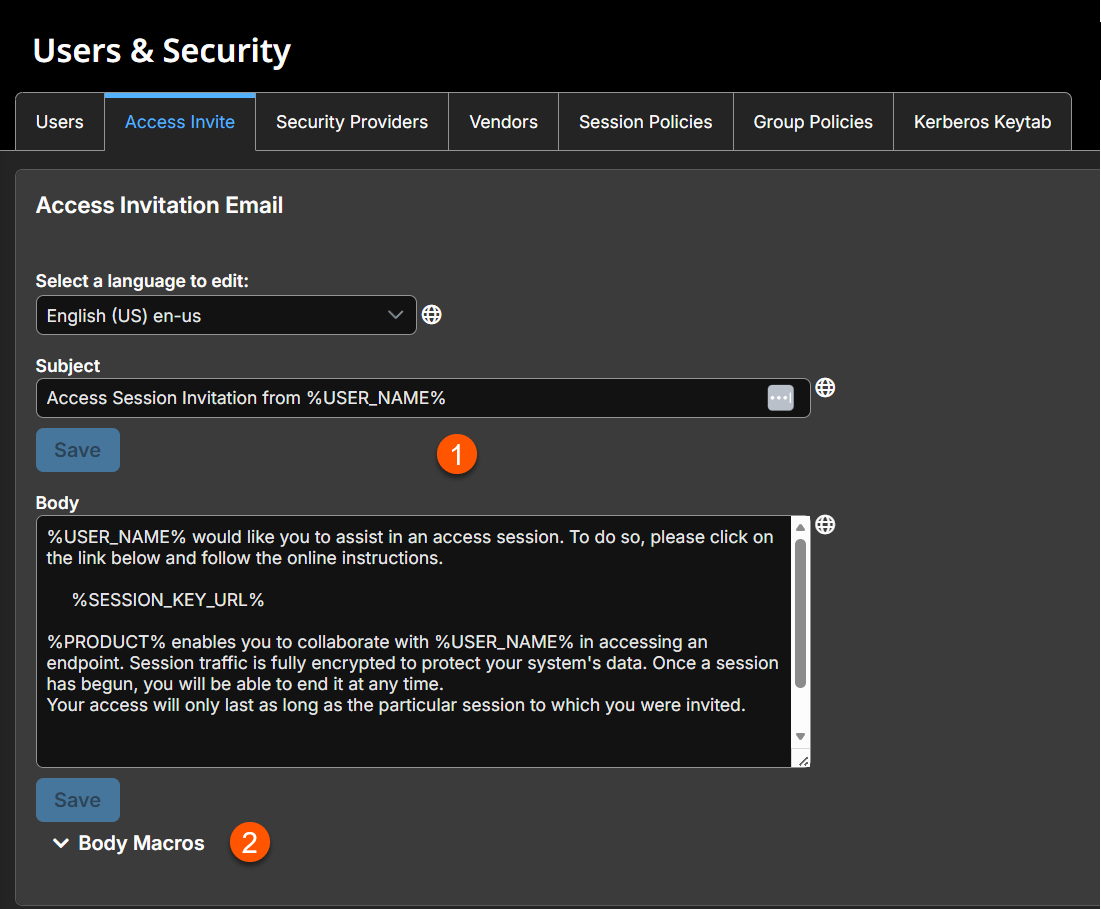 - Macro templates: Macros to use within the Body of the invitation.