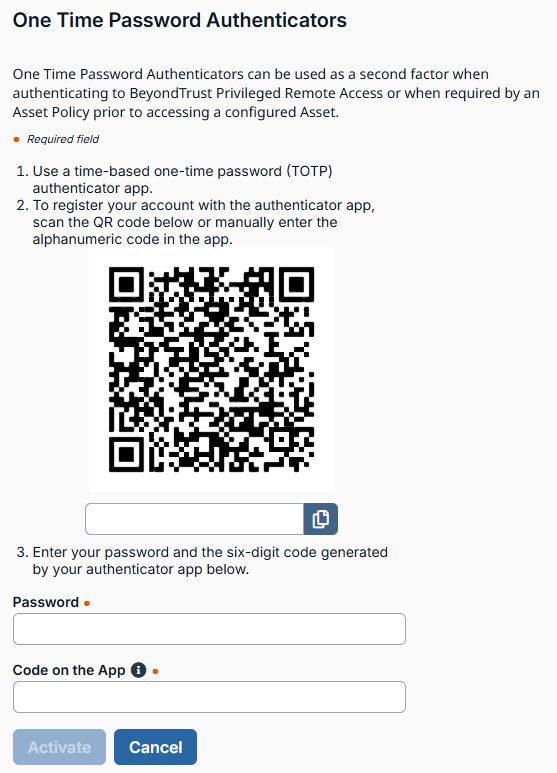 In Privileged Remote Access, scan the QR code, or, in your authenticator app, manually enter the generated code below the QR code.
