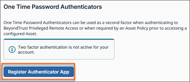 You can use one time password authentication as a second factor when authenticating into Privileged Remote Access, or when required by an Asset Policy prior to accessing a configured Asset.