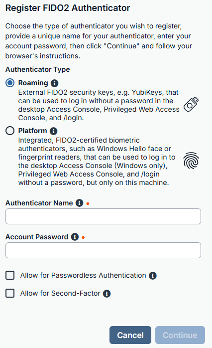 - Roaming: Roaming authenticators, or cross-platform security keys like YubiKeys, are FIDO2-certified external devices that use biometrics or a PIN for user verification. Use them instead of a password when signing into Privileged Remote Access (Windows only), the Privileged Web Access Console, and any machine and supported operating system that allows the use of external FIDO2 authenticators.