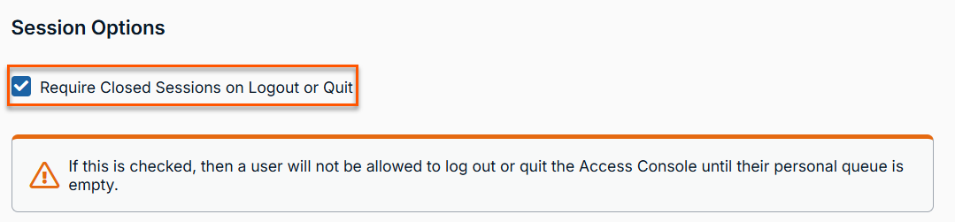 If you check Require Closed Sessions on Logout or Quit, users will be unable to log out of the console if they currently have any session tabs open.