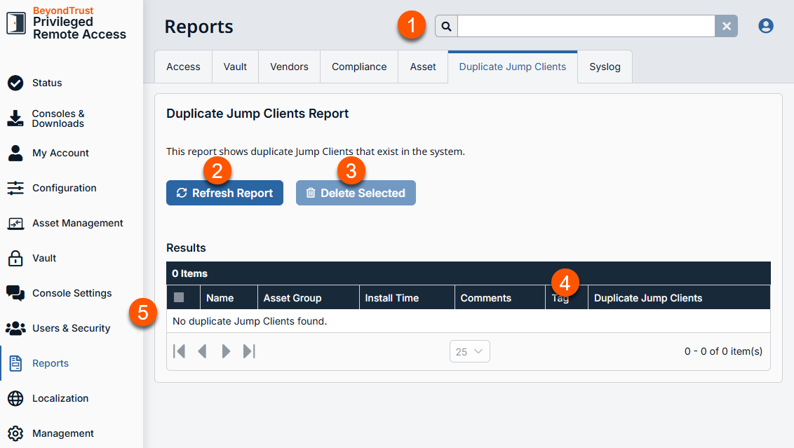 - The ability to select items in the Duplicate Jump Clients table and the Delete Selected button require administrator permission. If you do not have this permission, the ability to select rows in the table and the Delete Selected button is not available on the report page.