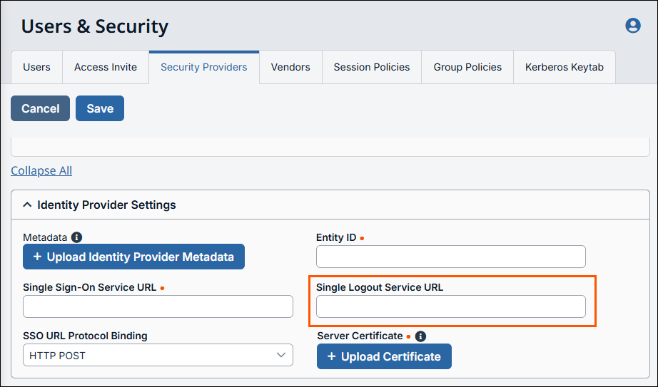 This URL is provided in the BeyondTrust welcome email and includes your site URL followed by /login. - From the left menu, click Users & Security.