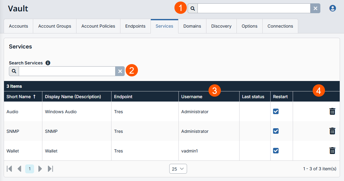 - Search for specific services or a group of services based on Short Name, Display Name (Description), Endpoint (Hostname) and Username.