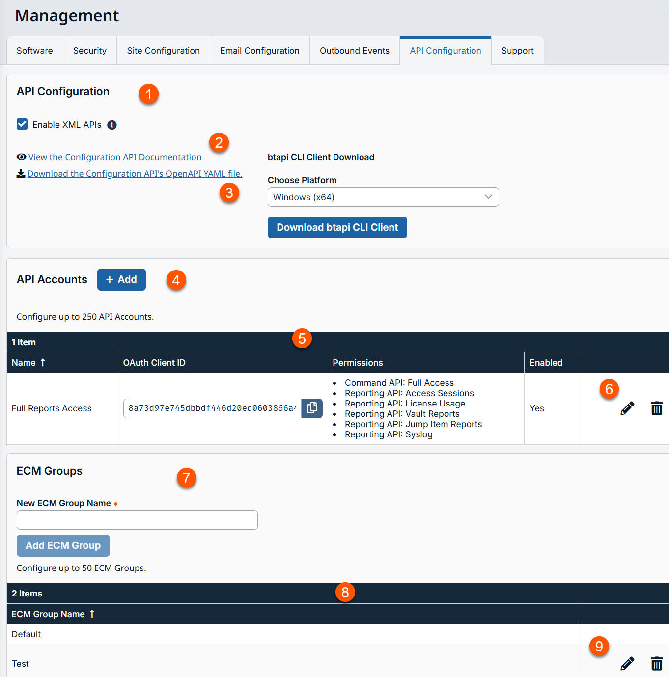 The Managment page opens and the Software tab displays by default. - Click the API Configuration tab.