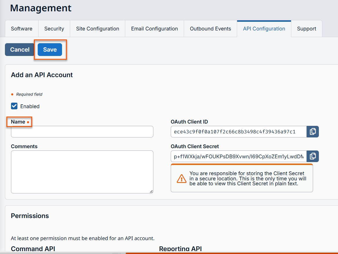 For OAuth Client ID, this is a unique ID generated by the B Series Appliance. It cannot be modified. The client ID is considered public information and, therefore, can be shared without compromising the security of the integration.
